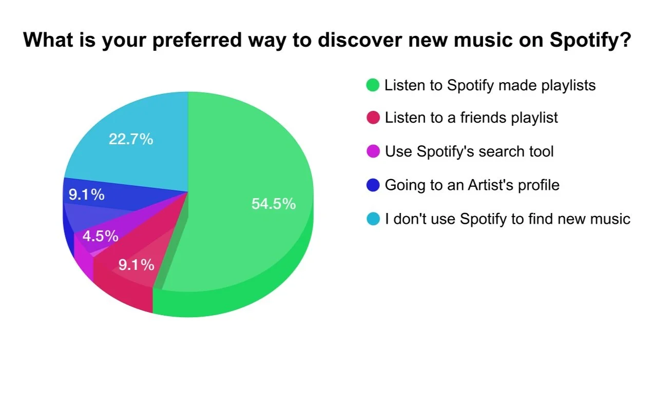Since the opportunity to discover different types of new music was not actualized in the current market, I conducted a survey with over 20 participants to see how users were spending most of their time and effort to reach this goal on Spotify.