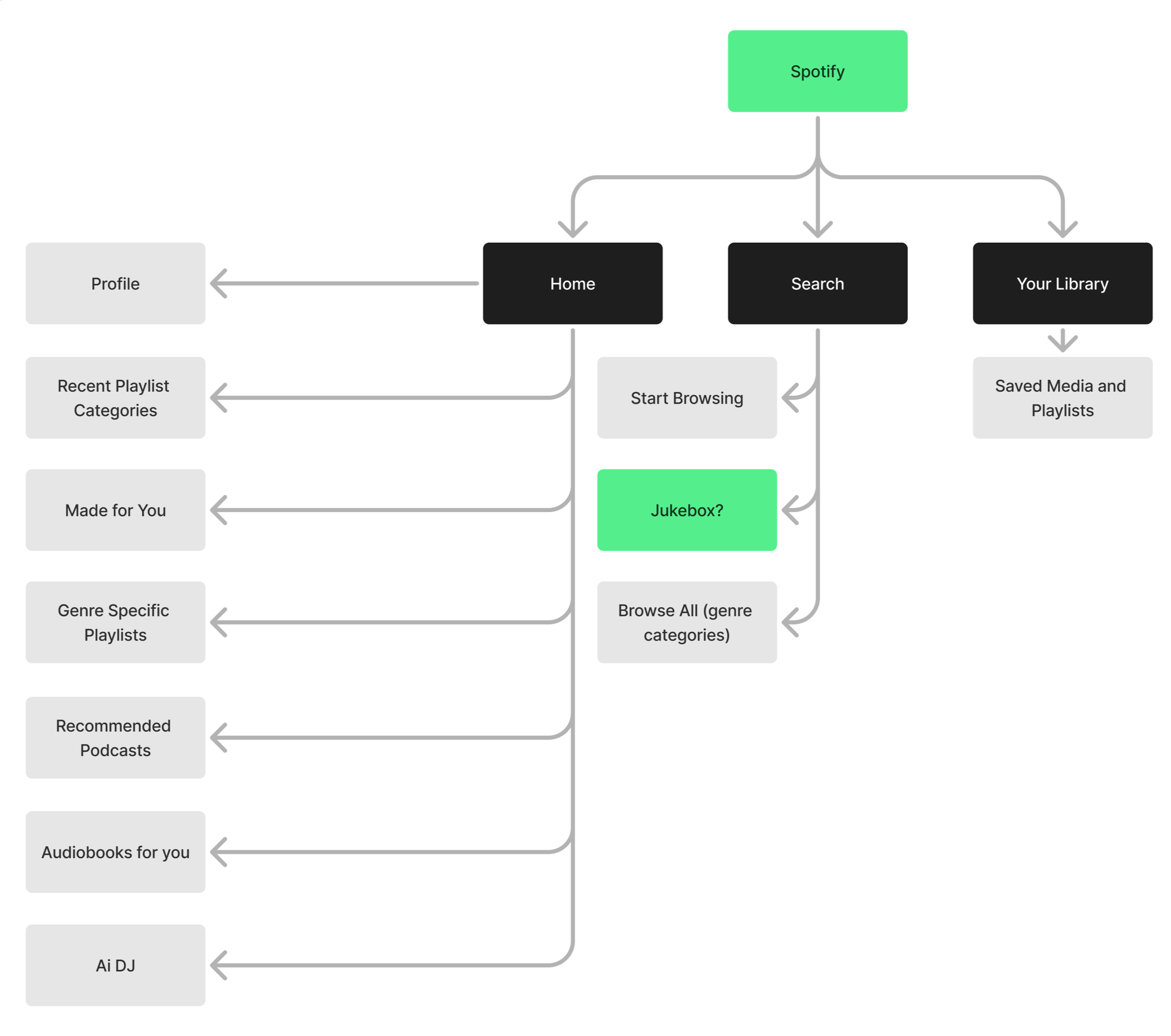 How did I arrive at Spotify Jukebox? I started mapping out the current Spotify mobile layout to understand the main touch points users had mentioned in interviews. My goal in creating a sitemap was to find a place for a new feature that could integrate seamlessly into the existing framework and wouldn’t be seen as overwhelming or out of place to a daily user.